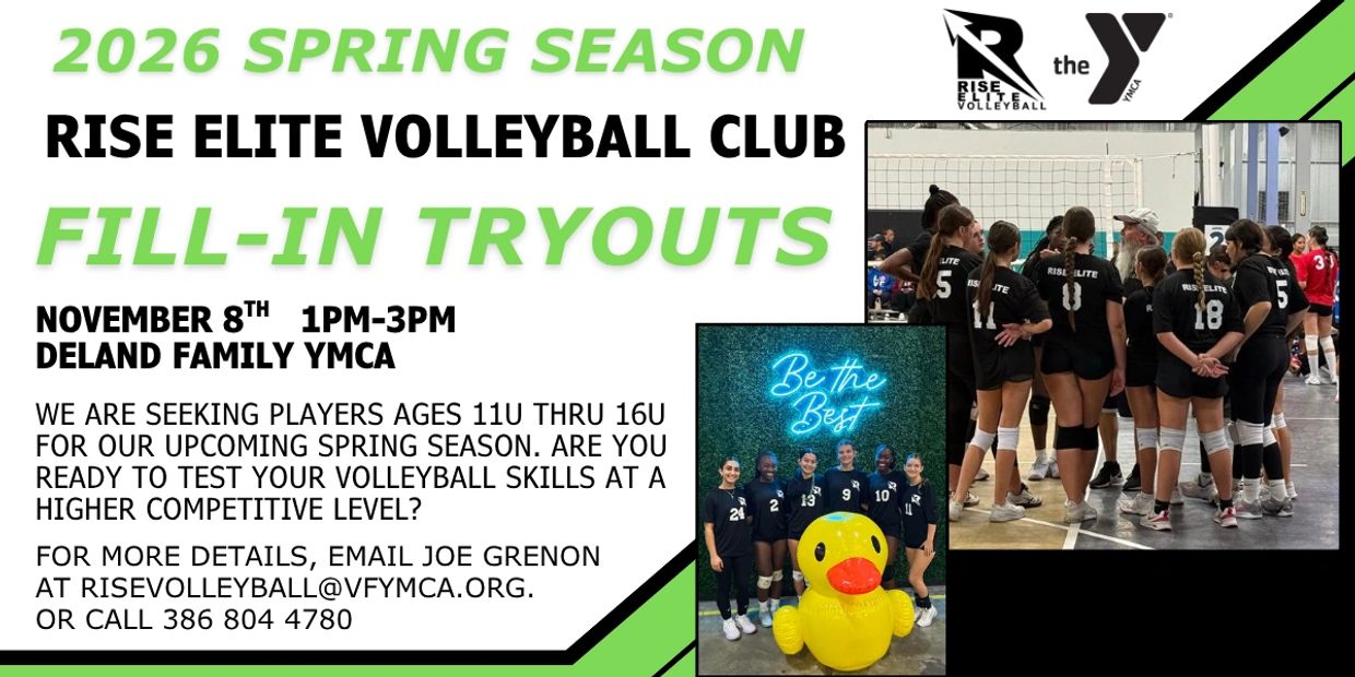 Our 2025-2026 Spring Tryouts are right around the corner! We will have tryouts at our Deland and Port Orange Locations. If you have any questions, please contact Joseph Grenon risevolleyball@vfymca.org