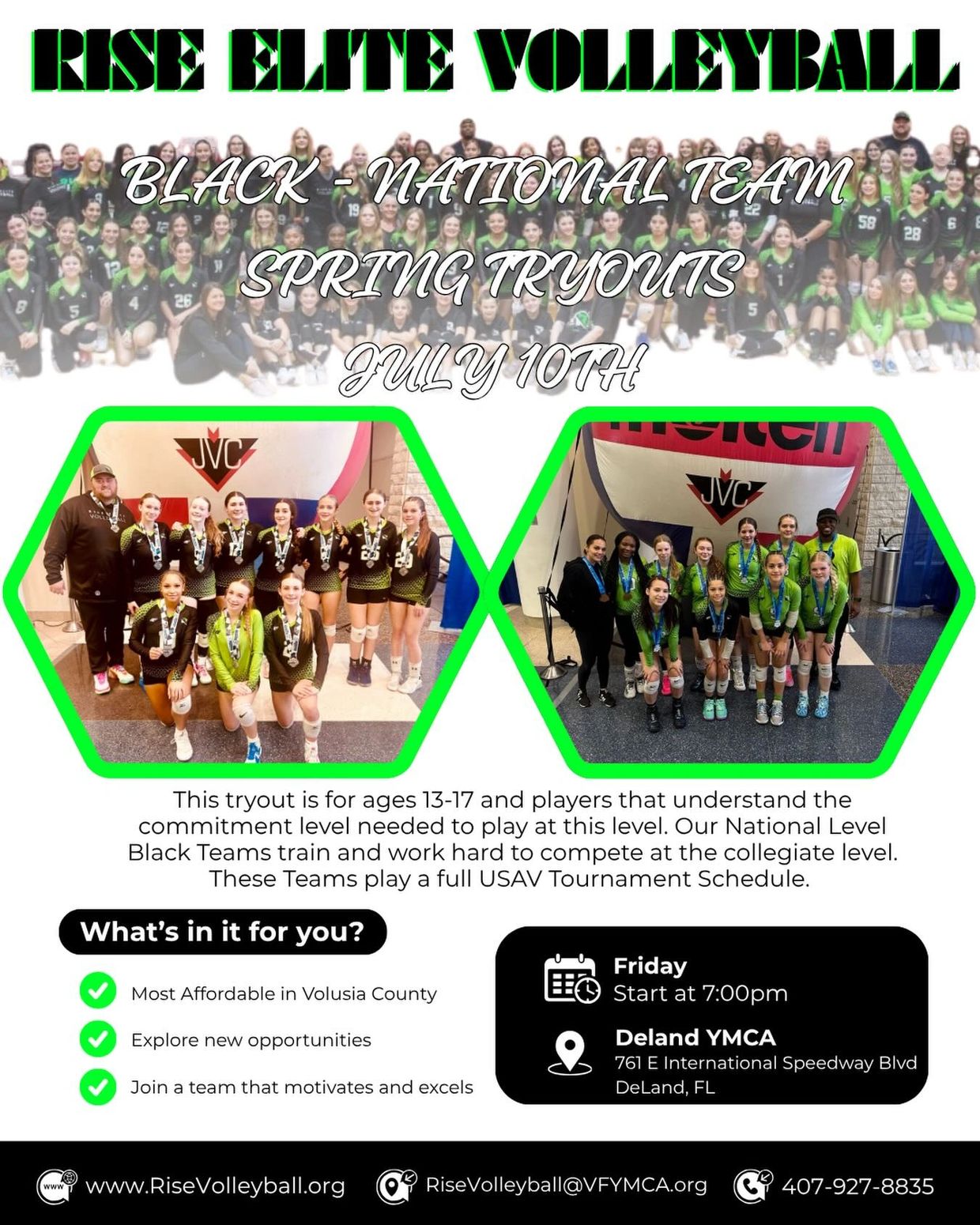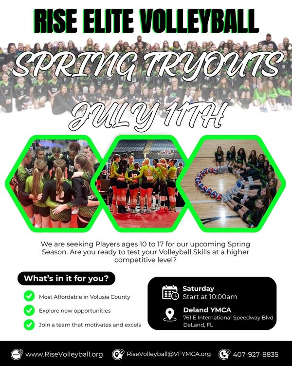 Our 2026-2027 Spring Tryouts are right around the corner! All Spring Tryouts will be at the Deland YMCA this season. If you have any questions, please contact Tabari Williams or Stephen Young risevolleyball@vfymca.org